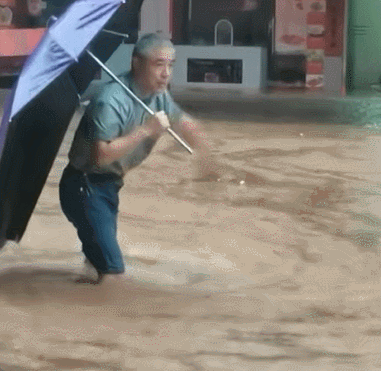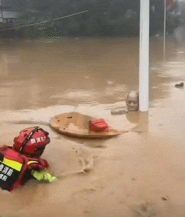 还是在广东梅州,一位老人被洪水围困,只有头部露出水面,紧紧抱住路灯不敢动。消防员小心翼翼接近并安抚老人情绪,最终成功将老人救出。