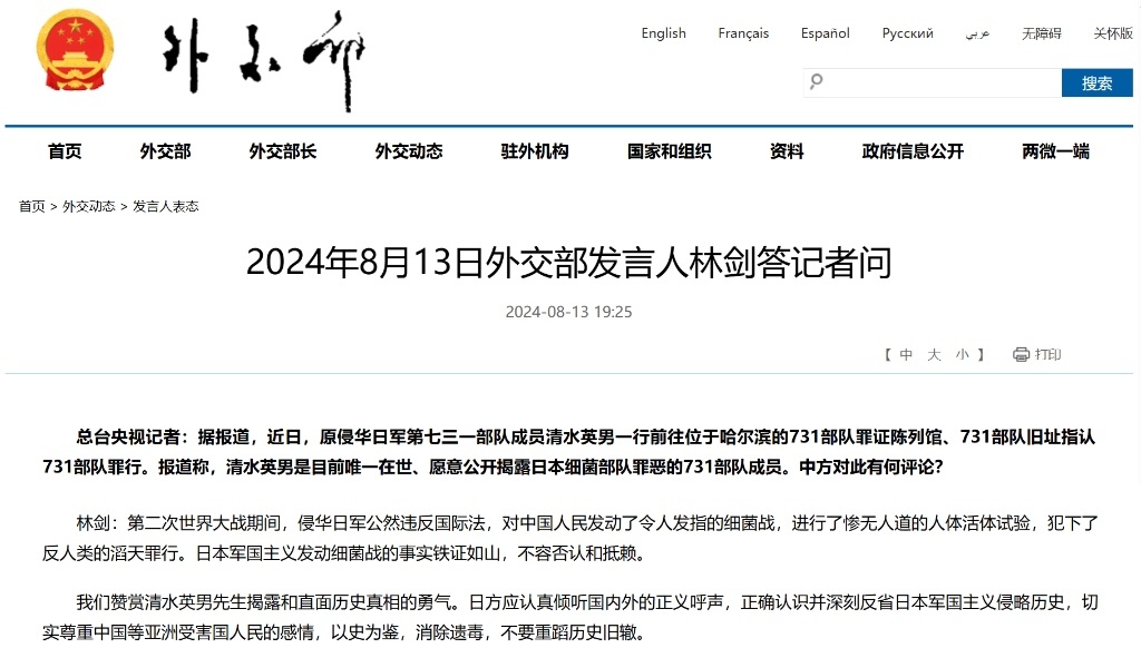 记者:据报道,近日,原侵华日军第七三一部队成员清水英男一行前往位于哈尔滨的731部队罪证陈列馆、731部队旧址指认731部队罪行。报道称,清水英男是目前唯一在世、愿意公开揭露日本细菌部队罪恶的731部队成员。中方对此有何评论?